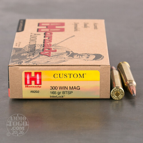 This is 300 Win. Mag Hornady Custom 165gr. Boat-tail Soft Point Ammo. This ammo is manufactured by Hornady and is considered to be the best factory loaded ammo available. This ammo is so good you will think you handloaded it yourself. If you want the very best, Hornady is your answer. It comes packed in 20rd. boxes