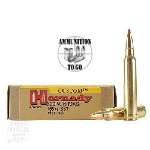 This package contains 20 rounds of Hornady Custom .300 Winchester Magnum ammunition. Each new production cartridge is loaded with a 165 grain Hornady SST (Super Shock Tip) projectile. This proprietary design delivers tremendous terminal energy transfer and expands quickly and reliably, particularly at high velocities. Flat shooting and deadly accurate, the SST incorporates an aerodynamic polymer tip, secant ogive design, and stabilizing boat tail base. These features work together to reduce drag, increase bearing surface, and provide amazing in-flight stability. The result is a hard-hitting, highly accurate expanding bullet.