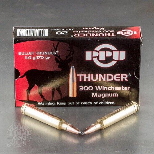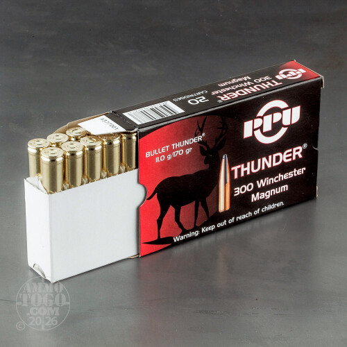 This package contains 20 rounds of Prvi Partizan Bullet Thunder .300 Winchester Magnum ammunition. Each cartridge is loaded with a 170 grain pointed soft point (PSP) projectile. Providing an optimal balance of reliable and controlled expansion, deep penetration, maximum weight retention, effective terminal energy transfer, and repeatable accuracy, these loads are effective for hunting game animals, including whitetails, elk, black bear, and various African game.