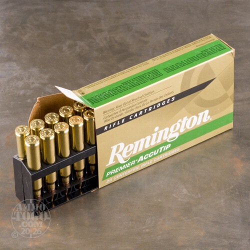 This new production Remington ammunition is packaged in boxes of 20 rounds. Each round is non-corrosive, boxer primed, and loaded in factory fresh brass casings. Loaded with a 180 grain AccuTip Boat tail projectile, these loads feature a polymer tip for maximum energy transfer and a jacket specially tuned for controlled expansion.