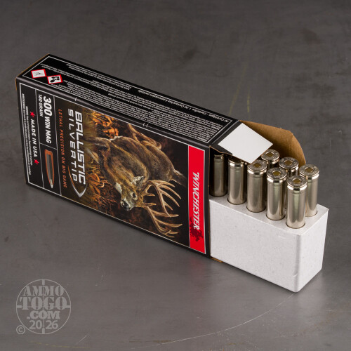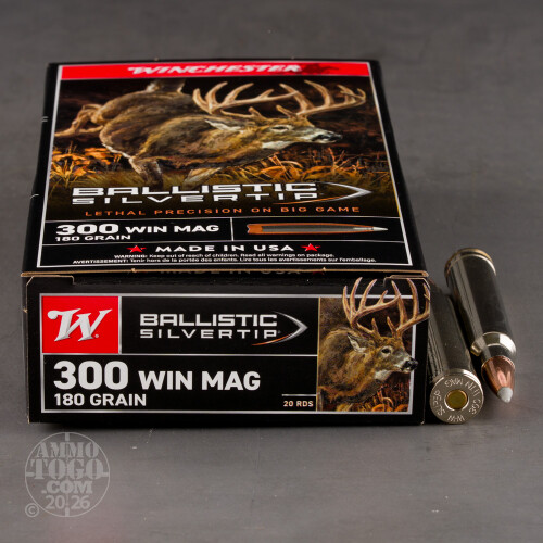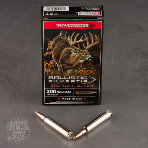 This is .300 Winchester Magnum 180gr. Winchester Supreme Ballistic Silvertip Ammo. For large and heavy game, featuring delayed, controlled expansion. Deep penetration through thick, tough skin, heavy muscle tissue and bone, high retained weight. This ammo is nickel coated brass cased, boxer primed, and 100% non-corrosive. Muzzle velocity of 2950fps. This ammo comes packed in 20rd. boxes.