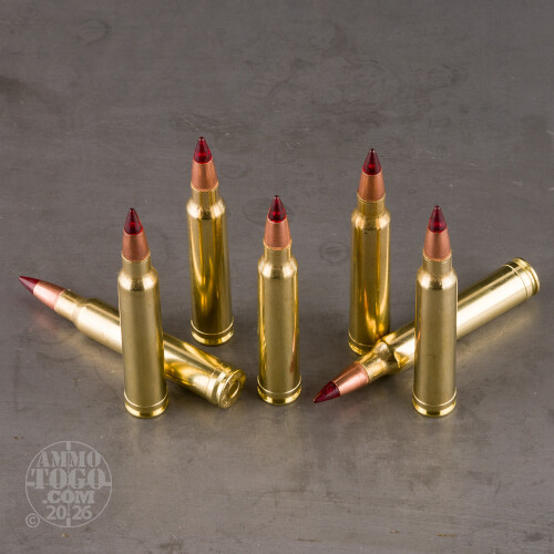 This round’s reloadable brass case holds the primer and propellant a 150 grain bullet needs to achieve a muzzle velocity of 3,260 fps. The bullet’s 0.393 G1 ballistic coefficient means that it drops to -6.47” at 300 yards after passing a 200-yard zero, and also that it conserves 1,000 ft lbs of energy at 702 yards.