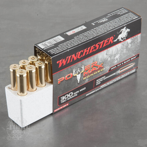 This is .300 Win. Mag Winchester Power Max Bonded 180gr. Protected Hollow Point Ammo. Power Max is the newest ammo Winchester has to offer and it is specially designed for the whitetail deer hunter. Power Max begins by welding the lead to a copper alloy jacket so the two act together during expansion for improved penetration and retained weight. Power Max uses a contoured jacket taper that is engineered to work with this bonding process. The aerodynamic design of the PHP - Protected Hollow Point - bullet design promotes long range accuracy and initiates maximum expansion. The bonding process keeps the lead adhered to the jacket after the expansion. The result of the engineering features working together is to provide massive expansion allowing for dramatic upset/knockdown. This ammo comes packed in 20rd0 boxes.