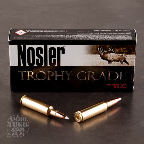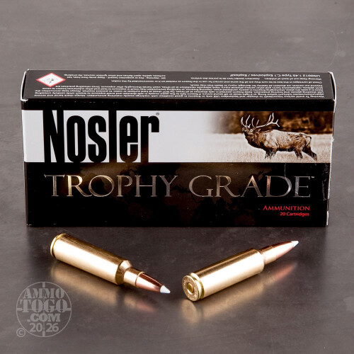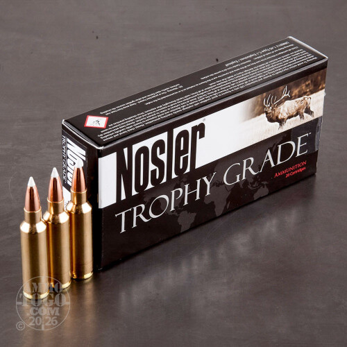 This package contains 20 rounds of Nosler Custom Trophy Grade .300 Win Short Mag ammunition. Each round is loaded with a 180 grain Accubond polymer-tipped projectile. These bonded core bullets feature a copper-alloy jacket bonded to a lead alloy core through a special proprietary process. Each bullet is topped with a white polymer tip designed to protect it from in-flight deformation and initiate terminal expansion. These rounds offer impressive long-range accuracy and deliver up to 70 percent weight retention, making them ideal for hunting medium to large game animals.