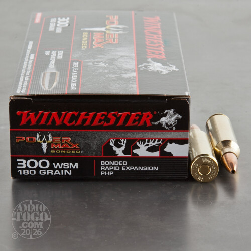 This is .300 WSM Winchester 180 grain Super X Power Max Bonded protected hollow point Ammo. When it comes to whitetail deer, it's important to have ammunition that delivers exception knockdown power as well as improved penetration and a high weight retention. Winchester uses a unique bonding process with their Power Max cartridges. This process takes a copper jacketed bullet and welds lead to it which allows for the improved performance. In addition to the bonding process, Power Max loads feature a protected hollow point that generates a massive mushroom that expands to twice the original diameter. Muzzle Velocity: 2731 fps Muzzle Energy: 3525 ft. lbs. This ammo is packed in 20 round boxes.