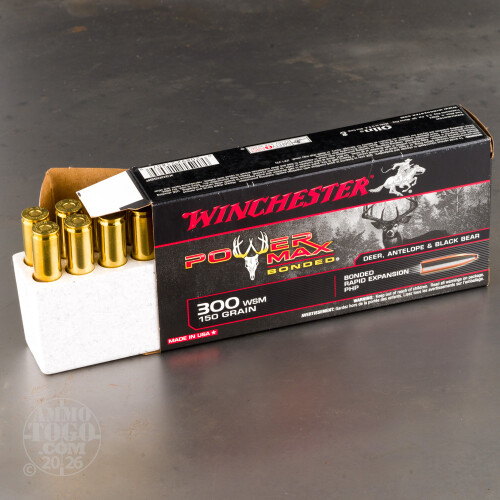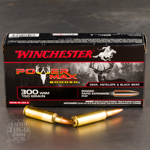 Bonded. Power Max Bonded. Winchester developed this 300 WSM ammo specifically for hunting medium-sized and larger deer, and to pull that off they gave it a high tech bullet: a bonded rapid expansion protected hollow point.This round’s 150 grain bullet is engineered to lose virtually zero percent of its weight as it pierces dense muscle and thick bone at high velocities. Its solid lead core is bonded to its jacket, keeping the two rooted firmly together in spite of what resistance they may incur. Because its core is so soundly welded to its jacket the bullet hangs onto the momentum it needs to penetrate to and through the vital area!
