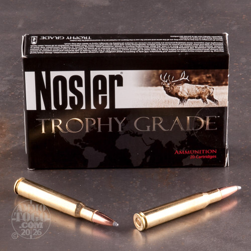 Leaving the muzzle at a velocity of 3000 feet per second, each round generates a muzzle energy of 2997 foot pounds. This ammunition is 100 percent non-corrosive, boxer primed, reloadable, and brass cased. Each package contains 20 rounds of versatile NoslerCustom Trophy Grade .30-06 Springfield ammunition suitable for whitetails, elk, black bear, mountain goat, and feral hogs, just to name a few.