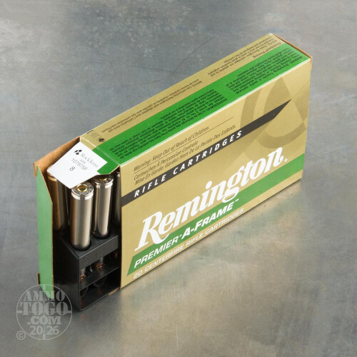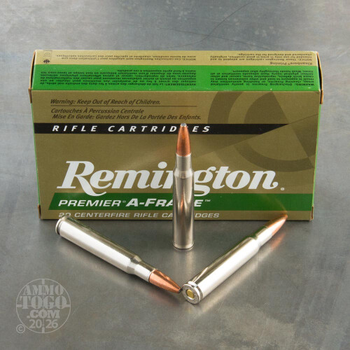 This package contains 20 rounds of Remington Premier Swift A-Frame .30-06 ammunition. Each cartridge is loaded with a 180 grain pointed soft point projectile. Featuring a dual core for reliable expansion at long-range decreased velocities, the unique construction of these A-Frame projectiles also resists over-expansion at short-range high velocities. Manufactured using a proprietary bonding process, Remington A-Frame bullets deliver controlled expansion to twice the caliber size and over 95% weight retention.