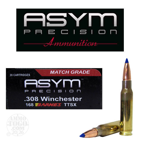 This is .308 Win. ASYM Match Grade 168gr. Barnes Tipped Triple Shock-X Ammo. This round provides dependable penetration through barriers, and devastating performance on big game. The solid copper construction of the Barnes Tipped Triple Shock bullet offers near 100% weight retention, dramatic expansion and deep penetration. In tactical applications, it punches through barriers such as auto glass and sheet metal with minimal deflection, while still performing well in soft tissue on the other side. In hunting applications, its violent expansion and deep penetration offers devastating performance on big game, up to and including elk sized animals. The precise loading of this bullet offers excellent consistency and match grade accuracy. Precision loading techniques ensuring concentricity, uniformity of bullet pull, seating depth and consistent powder charges yield highly accurate cartridges which will perform when precision is needed most. Every round of ASYM .308 ammo is chamber checked and hand inspected. This ammo comes packed in 20 round boxes.
