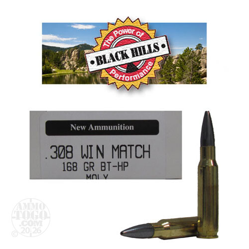 This is .308 Win. Black Hills 168gr. New Seconds Match Boat Tail Hollow Point Moly Coated Ammo. This is Black Hills factory seconds (white box) ammo. It is called seconds due to minor cosmetics. This ammo has a Moly coating on it, the moly coating reduces barrel wear, residue in the barrel, and in some cases even enhances velocity. This ammo still goes thru Black Hills stringent inspection test. Black Hills Ammunition is highly respected all over the country. Black Hills supplies all five US military branches with ammunition. There are many Law Enforcement Agencies using Black Hills nationwide. They only use the best components available. This factory new ammo is very accurate, dependable, 100% non-corrosive, boxer primed, non-magnetic and reloadable. It comes packed in 20rd. boxes.