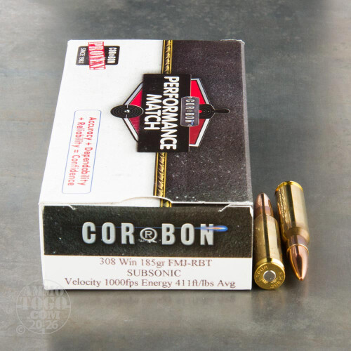 This is .308 Corbon Performance Match 185gr. Sub-Sonic Full Metal Jacket Baottail Ammo. This ammo is loaded with a 185gr. Boattail FMJ Bullet. This ammo is traveling at 1000 FPS and has 417lbs. of energy. This ammo is completely quiet out of a suppressed weapon. These rounds will not cycle a semiautomatic weapon and will require hand cycling. This ammo is packed in 20rd. boxes.