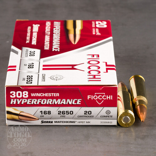 This is .308 Win. Fiocchi 168gr. Sierra MatchKing Hollow Point Ammo. This ammo is made with match grade components and is very accurate. It comes boxer primed, 100% non-corrosive and reloadable brass cases. This ammo comes packed in 20rd boxes.