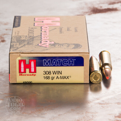 This is .308 Hornady A-MAX Match 168gr. Ammo. The 168gr. A-MAX Match bullet is a traditional match grade weight with the advantages of a polymer tipped bullet’s terminal performance. This match grade bullet demonstrates an increase in penetration and retained weight. This ammo is packed in the 20rd. boxes.