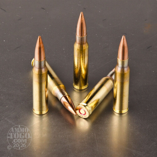 This ammunition is new production, boxer primed, and non-corrosive. Each round has a sealed primer, annealed case neck, and a reloadable brass casing. Leaving the muzzle at a velocity of 2837 feet per second, these rounds produce 2596 foot pounds of muzzle energy.