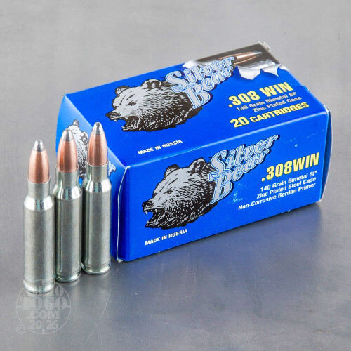 This is .308 Silver Bear 140gr. Soft Point Ammo. This ammo is manufactured by JSC Barnaul Machine-Tool Plant in Russia. Barnaul is considered to be the premier ammunition factory in Russia, and it supplies most of the ammo to the Russian Military. This ammo has a unique zinc plated steel case, which gives you all the characteristics of nickel plated brass, at a fraction of the cost. Since this ammo is Zinc plated, it functions much smoother than any other steel cased ammo. This ammo is 100% non-corrosive. It comes packed in 20rd boxes