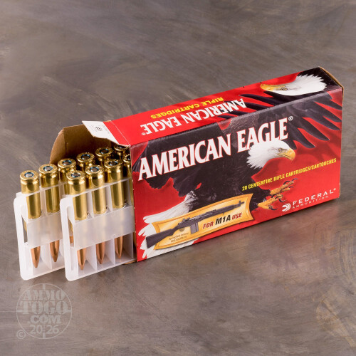 This is .308 Winchester (7.62x51) Federal American Eagle 168gr. Open Tip Match Ammo. This Federal ammo is designed to function in a Springfield M1A. This is great shooting ammo at reasonable price. This ammunition is new production, non-corrosive, in boxer-primed and has reloadable brass cases. This ammo comes packed in 20rd. boxes.