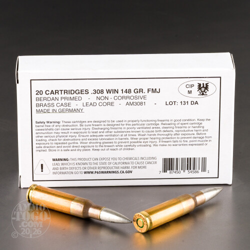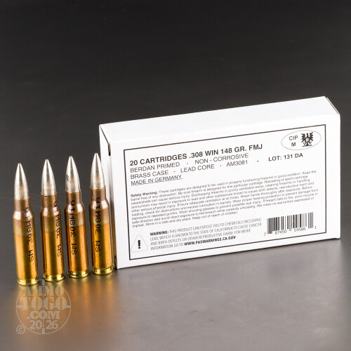 Disclaimer: This German-made ammo's new production brass cases have accumulated some cosmetic corrosion during over the decades they have spent in storage.Here we have the German military’s take on a classic American cartridge. This 308 Win ammo is perfect for zeroing a scope on your hog and deer rifle, having a bit of fun target shooting, or keeping in store for some sort of looming crisis.