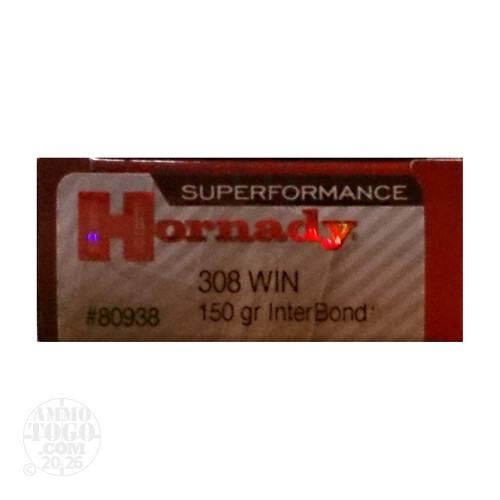 This is 308 Win. Hornady Superformance 150gr. InterBond Polymer Tip Ammo. Hornady InterBond bullets use a proprietary bonding process that holds the core and jacket together regardless of what the bullet encounters. The polymer point improves ballistic performance, accuracy and initiation of expansion. This ammo is manufactured by Hornady and is considered to be the best factory loaded ammo available. If you want the very best, Hornady is your answer. This ammo is brass cased, boxer primed, and 100% non-corrosive. Velocity 3000fps. It comes packed in 20rd. boxes.