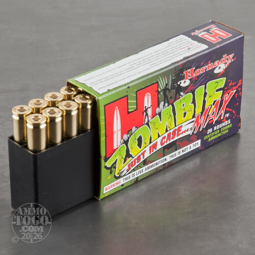 This is .308 Win. Hornady Zombie Max 168gr. Z-MAX Ammo. Be prepared – supply yourself for the Zombie Apocalypse with new Hornady Zombie Max ammunition! This round is loaded with proven Z-Max bullets. Make sure your "bug out bag" is ready with nothing but the best! Stay focused! Zombies will try to distract you by waving their arms all over. Destroy their brain before they try to eat yours! This ammo comes packed in 20rd. boxes.