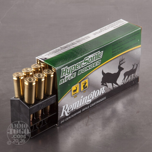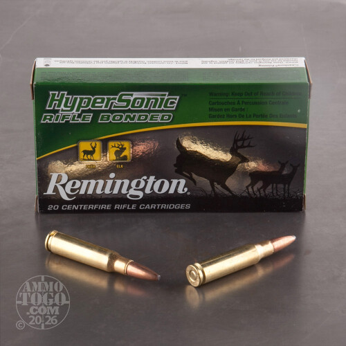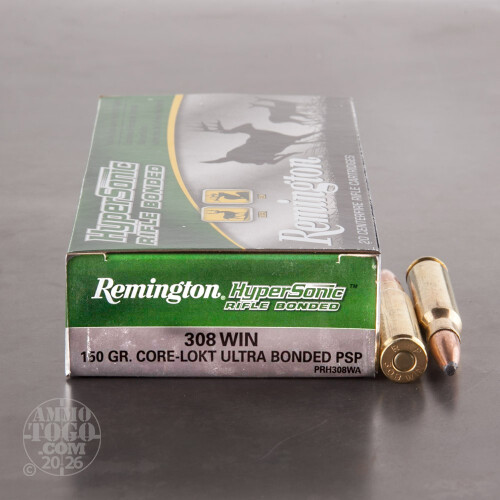 This package contains 20 rounds of Remington HyperSonic .308 WInchester (7.62x51) ammunition. Each cartridge is loaded with a 150 grain Core-Lokt Ultra Bonded pointed soft point projectile. The bonded construction of these world-class bullets delivers 95 percent weight retention while producing controlled mushrooming up to 2 times the original diameter. The result is hard-hitting terminal performance and a massive and devastating wound.