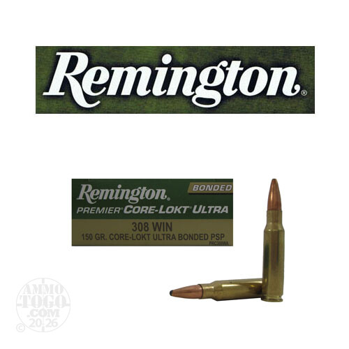 This package contains 20 rounds of Remington Premier Core-Lokt Ultra .308 Winchester ammunition. Each cartridge is loaded with a 150 grain bonded pointed soft point projectile. The unique bonded construction of these proprietary bullets delivers an amazing 95 percent weight retention while the soft lead point expands up to twice the original diameter. The result is hard-hitting terminal energy and a massive wound channel for quick and humane kills.
