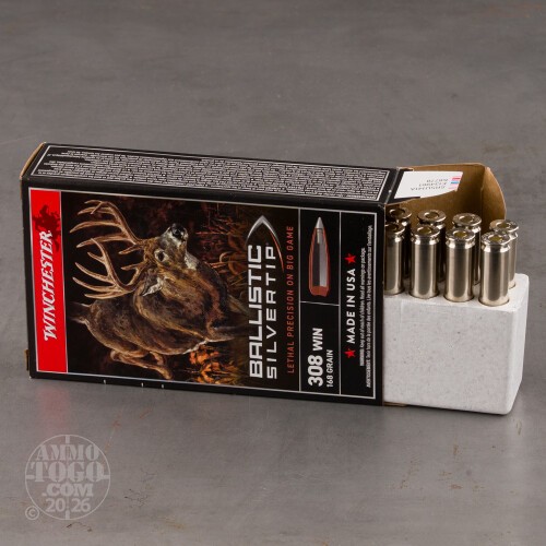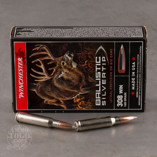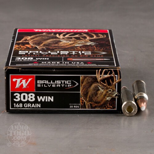 This is 308 Win Winchester Ballistic Silvertip 168gr. Polymer Tip Ammo. Polymer Tip, Alloyed Lead Core, Contoured Jacket, Rapid Controlled Expansion. This ammo is nickel coated - brass cased, boxer primed, non-magnetic and non-corrosive. It comes packed in 20rd. boxes. Muzzle Velocity: 2670 FPS.