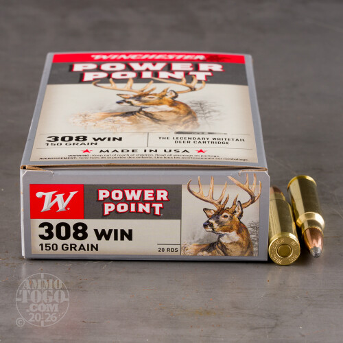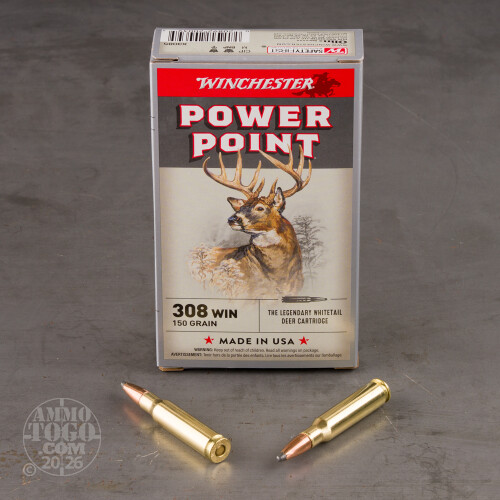 These .308 Winchester rounds offer potent energy to get the job done right when you're on the hunt for big game like wild hogs, whitetail deer, and even smaller moose or black bears. Winchester manufacturers this ammunition in Illinois using top-tier assembly processes, inspection points, and component materials. Each round is based on a reloadable brass casing which has a non-corrosive Boxer primer affixed to its bottom. The cartridge is finished with Winchester's own Power-Point projectile which weighs in at 150 grains: a proven weight for the .308 caliber that matches many military surplus and range loads.The Power-Point bullet goes above standard soft points by including small skivings where the copper jacket meets the exposed lead tip along with a toothed cannelure at its crimp point. The former promotes reliable expansion at a wider range of impact distances while the latter prevents the jacket and lead core from separating; components that separate don't penetrate as deeply and can shallowly wound an animal while leaving it to run off, an inhumane outcome that no hunter wants. When this round expands in a target, it passes its energy to vital areas and promotes faster bleeding for a quicker kill and more tasteful meat that isn't laced with adrenaline.