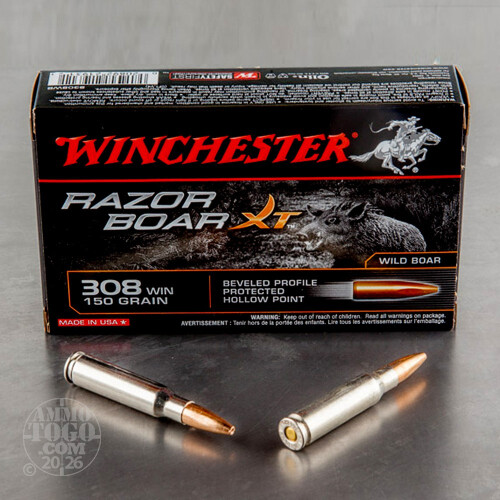 This is .308 Winchester Razorback XT 150gr. Beveled Profile Protected Hollow Point Ammo. Razorback XT ammunition is designed specifically for the rugged demands of boar hunting. It drives through thick hide and bone to deliver lethal impact on the toughest wild boars. Engineered hollow point is optimized for delayed expansion through heavy hide. Winchester loaded these rounds with a low flash powder that reduces muzzle flash, preventing night blindness. Lead-free bullet offers maximum weight retention and strength. Muzzle velocity of 2810 fps. This ammo is packed in 20rd. boxes.