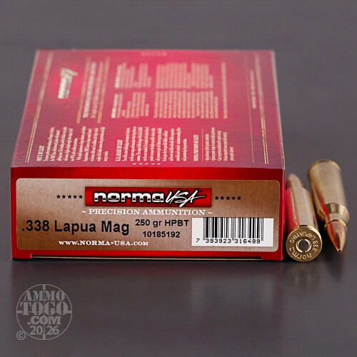 This is Norma's Match grade 338 Lupua Magnum ammunition. It features Sierra's oustanding MatchKing bullet, weighing in at 250 grains. This bullet is a hollow point boat-tail bullet, which provides consistent groups and excellent long range accuracy and excellent in-flight stability. The boat-tail on the bullet improves long range accuracy by decreasing wind drift and yaw while in flight. Although this bullet does have a hollow point, it may not expand like purpose made hunting ammunition. These rounds are purpose made for competition shooting, and will help you bring home the gold at you next shoot.This ammunition is loaded using reloadable brass casings and non-corrosive Boxer-primers.
