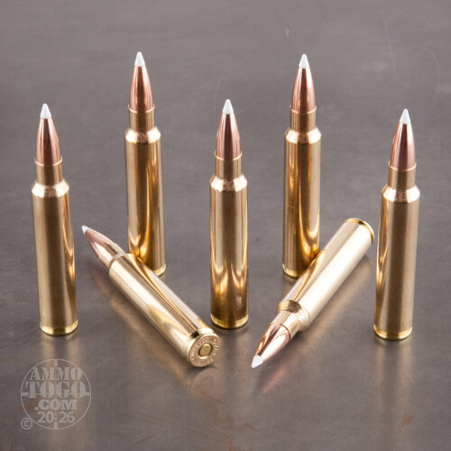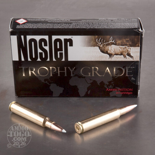 This 338 RUM (Remington Ultra Magnum) cartridge by Nosler features a 225 grain AccuBond projectile. The bullet is created via an exclusive process that leaves no voids in its core, and further bonds the core tightly to its jacket. This bullet’s tapered copper alloy jacket and lead alloy core are both engineered to promote balanced expansion, and their inseparability enables them to retain virtually all of their weight during penetration. The AccuBond’s substantial base provides a platform that even further promotes reliable penetration and expansion.The AccuBond owes its superior accuracy to its boat tail design and its white polymer tip. The latter additionally enables smooth feeding and protects the bullet’s meplat from deforming as the result of recoil. Nosler’s Trophy Grade ammunition also provides the uniform brass casing and dependable primer that you need to make your hunt a resounding success, and its propellant burns clean to produce the consistent muzzle velocity that accurate shooting hinges upon.