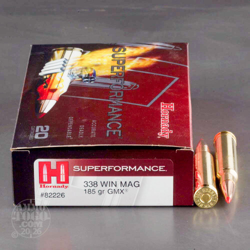 This package contains 20 rounds of Hornady Superformance .338 Winchester Magnum ammunition. Each round is loaded with a 185 GMX projectile. These hard-hitting bullets deliver deep penetration with a non-traditional, monolithic construction. Using a copper/zinc alloy, GMX projectiles retain 95 percent of their original weight and expand up to 1 ½ times their original diameter.