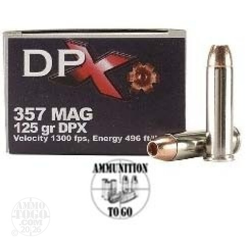 This package contains 20 rounds of Corbon DPX .357 Magnum ammunition. Each round is loaded with a 125 grain Barnes X hollow point projectile. Barnes X bullets are engineered using solid, heat-treated copper, eliminating core/jacket separation for 100 percent weight retention.