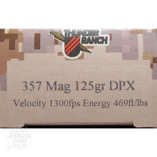 This is 357 Mag Corbon Thunder Ranch DPX 125gr. Hollow Point Ammo. Thunder Ranch Training Center and Cor-Bon have teamed up to produce this deep penetrating, 100% weight retention ammunition. Corbon products have earned a distinctive reputation in the industry with their high energy JHP ammunition. They maintain that standard with this new DPX line, it has a deeper penetration to make it the optimum load for Law Enforcement and civillian use. This ammo is loaded with the Barnes X Bullet, which retains 100% of its weight, even after shot through barriers such as clothing and steel. The permanent crush cavity is considerably larger than a typical hollow point due to deeper penetration. The Barnes X-Bullet is a solid copper projectile, heat treated for extra toughness. There's no separate jacket and no lead core. The bullet holds together for deep, dependable penetration---every time! A deep forward cavity causes the nose to peel back in four separate, razor-edged petals. Viewed head on, the appearance of these four petals gives the X-Bullet its name. This ammo is packed in 20rd. boxes.