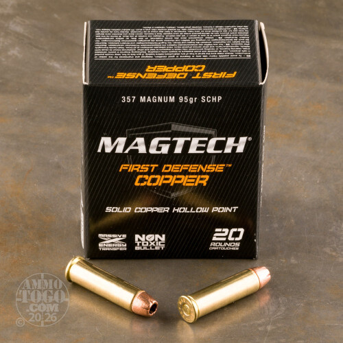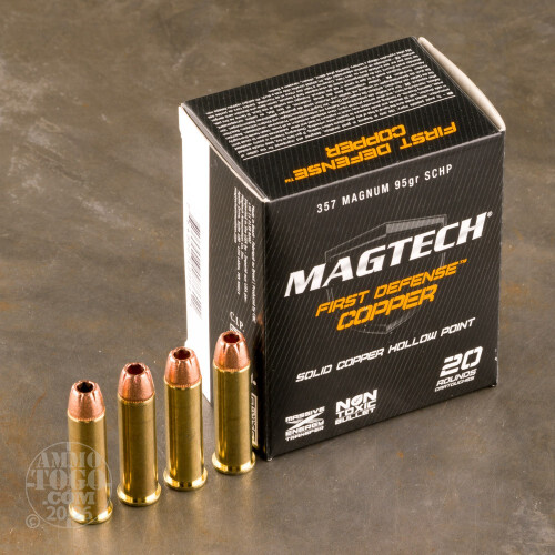 This is 357 Mag Magtech 95gr. First Defense Solid Copper Hollow Point Ammo. Magtech first defense rounds are designed with a 100% solid copper bullet, unlike traditional hollow points that contain a lead core covered by a copper jacket. Copper jackets could tear away when fired, causing a loss of weight and a corresponding loss of power. However, Magtech first defense solid copper bullets have no jacket to split or tear away, ensuring every round you fire meets its target with maximum impact and effectiveness. This ammo comes packed in 20rd. boxes.