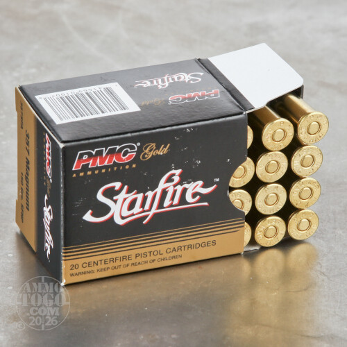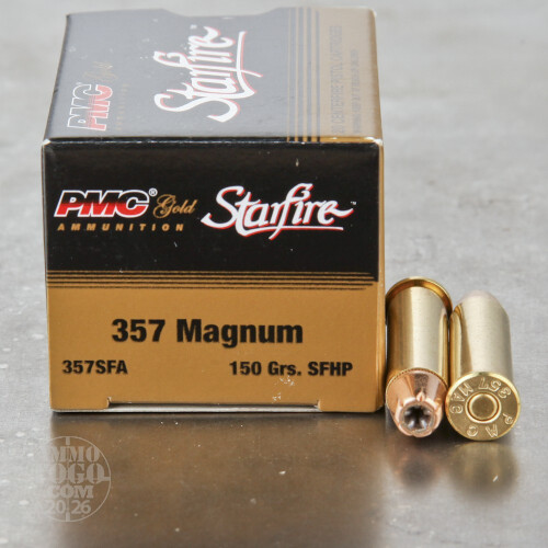 This is 357 Mag PMC Starfire 150gr. Hollow Point Ammo. PMC's Starfire line is a very impressive self-defense round at an affordable price. This patented rib-and-flute hollow point cavity design is a good choice for carry weapons. Upon impact, the pre-notched jacket mouth begins to peel back, separating into five uniform copper petals creating a large wound channel. This ammo is new production, non- corrosive and 100% reloadable brass cases. Comes packed in 20rd. boxes.