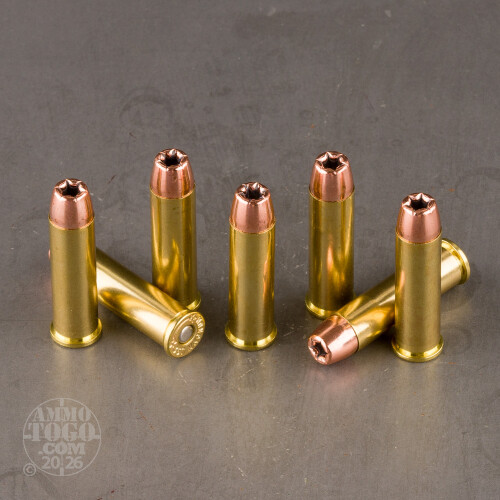 A revered brand like Colt probably could have chosen any company to manufacture 357 Magnum ammunition on their behalf. They chose Doubletap, which has cultivated a reputation for outstanding quality since their foundation in Utah in 2002.Doubletap didn’t reinvent the wheel when they designed this wheel gun (and lever-action rifle) ammo, but sticking to what works is never a bad thing. This round’s massive 158 grain projectile can slam into close-range target with over 800 ft lbs of energy, which is unarguably powerful enough to put an immediate stop to any threat’s worst plans. The jacketed hollow point combines deep penetration with reliably fast and wide terminal expansion. One well-placed shot will end the altercation in an instant.