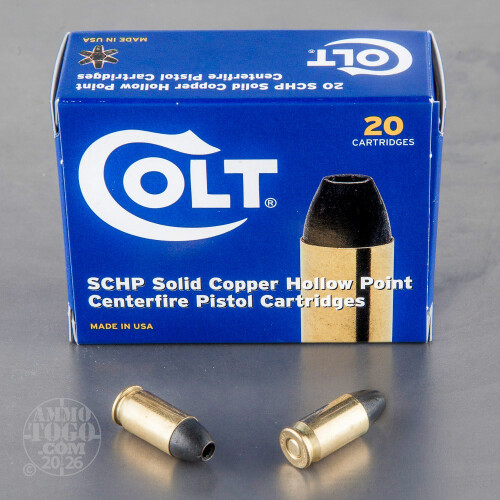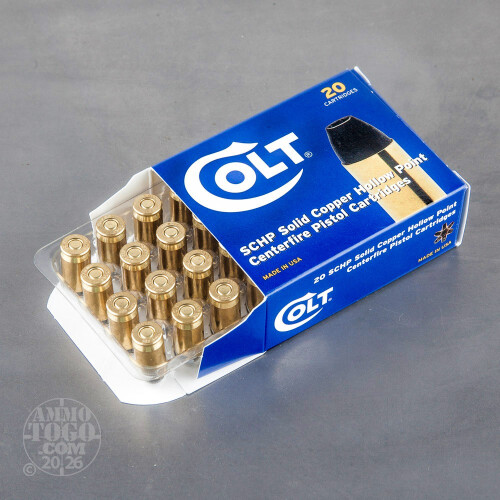 These Colt-branded .380 ACP rounds are manufactured by DKG Trading, the same company behind the well known Nobel Sport and Barnaul Bear brands! The Colt name has long been associated with shooting innovation and ingenuity and these rounds represent more of the same with a unique solid copper hollow-point (SCHP) design. This bullet profile contains no lead, a solid base, and a hollow cavity with thin, serrated walls which peel back into a star pattern upon impact without breaking away from the body. This construction is designed for reliable expansion even at low velocities from short barreled carry guns.