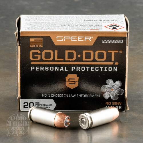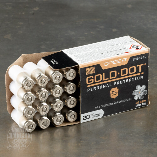 This 40 S&W cartridge is from Speer’s Gold Dot line of ammunition. If you want a round you can trust to neutralize even the most tenacious threat fast, then you want a Gold Dot. This cartridge’s 180 grain projectile has a hollow cavity which has been formed via a two-part process. In the first, the diameter that the bullet can expand to is determined; In the second, its rate of expansion is preset. As the result this bullet leaves little to chance when it comes time for it to create as gaping a wound cavity as it’s able to.A Gold Dot bullet’s jacket has been applied to its core one molecule at a time via Speer’s proprietary electrochemical process. Because of this the jacket is not only remarkably uniform to promote stable flight, but also tightly bonded to its core for assured weight penetration. This round’s brass casing is plated with nickel to enhance its lubricity as well as its visibility, and its CCI primer is sensitive enough that you may confidently count on it in a perilous situation. Many cops rely on Gold Dot to keep themselves safe on the streets -- why not you, too?