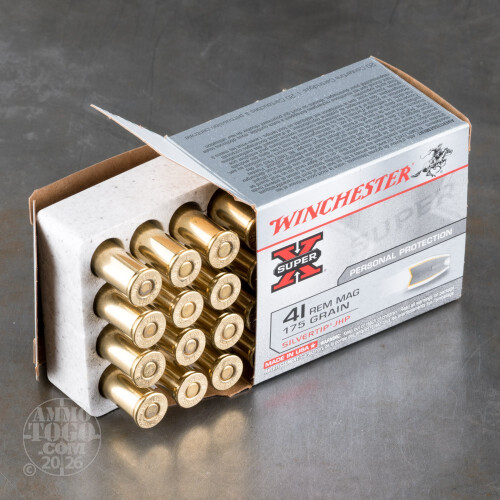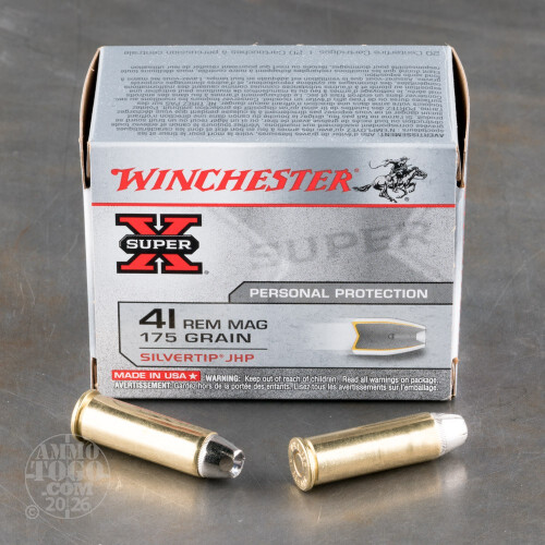 This is 41 Mag. Winchester Silver Tip 175gr. Jacketed Hollow Point Ammo. Winchester silver tip offers massive energy deposit, accuracy, optimum penetration, and consistent expansion. This ammo comes packed in 20rd. boxes.