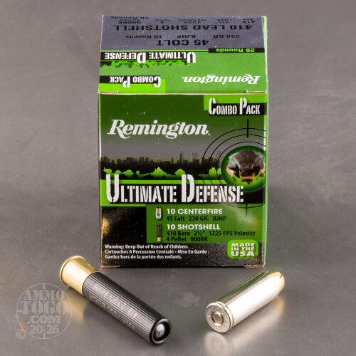 20rds - .410/.45 Colt Remington Ultimate Defense .410 2 1/2" 000 Buck / .45 Colt 230gr. BJHP Combo Pack Ammo Details