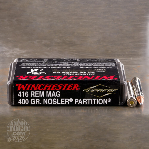 This is .416 Remington Magnum Winchester Supreme 400gr. Nosler Partition Ammo. This safari round offers delayed, controlled expansion and deep penetration through thick, tough skin, heavy muscle tissue and bone, with a high retained weight. This round has a muzzle velocity of 2500fps. This ammo comes packed in 20rds. per box.