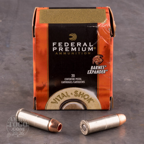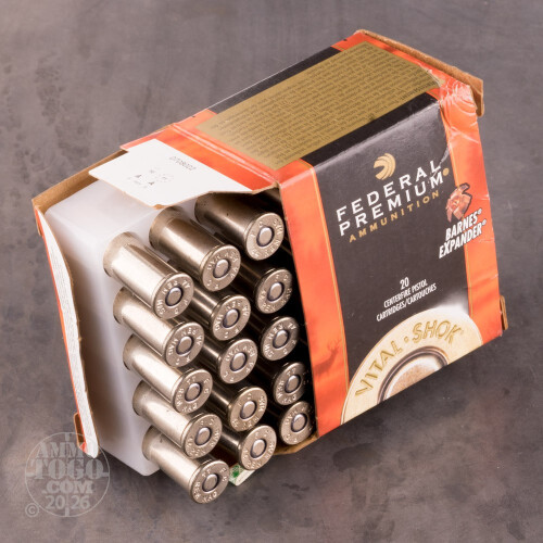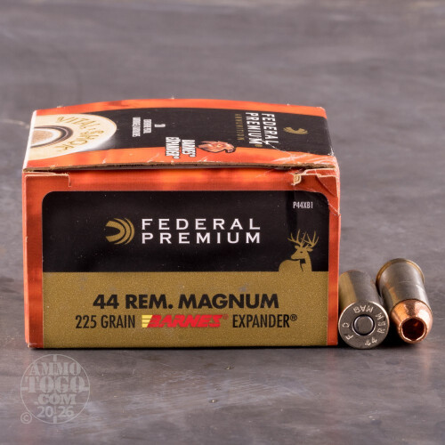 This is .44 Mag. Federal 225 grain Barnes Expander Vital-Shok ammo. This ammo has been developed for handgun hunting which is one of the most challenging ways to take game. You choose to use your wheelgun because you like to get up close and personal with your trophy. The Vital-Shok with the Barnes Expander allows for outstanding expansion upon striking the target. This ammo comes packed in 20 round boxes.