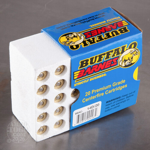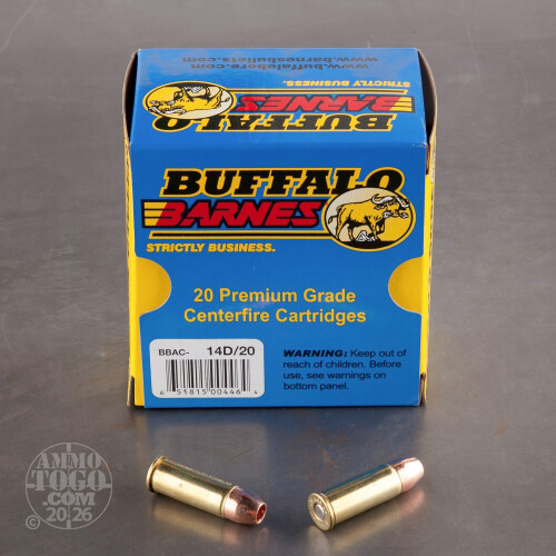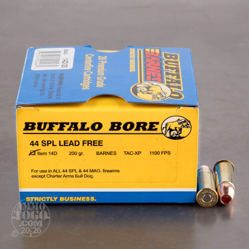 This package contains 20 rounds of Buffalo Bore .44 Special ammunition. Each cartridge is loaded with a 220 grain Barnes TAC-XP jacketed hollow point projectile. These lead-free bullets expand on impact with bone or soft tissue and penetrate deeper than most expanding lead core bullets of the same grain weight.