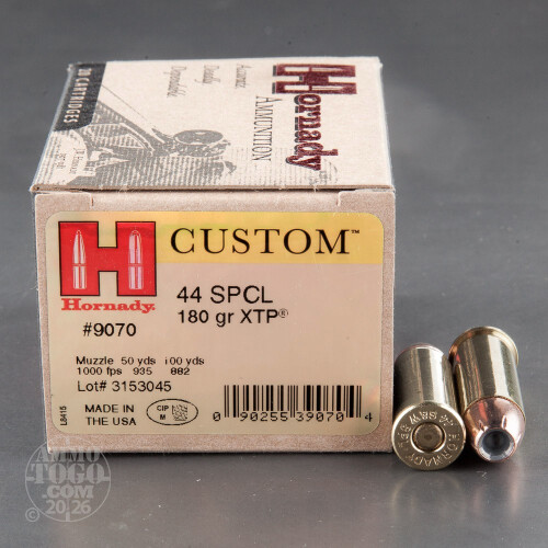 This is .44 Special Hornady Custom 180gr. Extreme Terminal Performance Ammo. Hornady Custom pistol ammo is loaded with the famous Hornady XTP (Extreme Terminal Performance) bullet. This round is supremely accurate, and delivers maximum knockdown power. This ammo is brass cased, boxer primed, and non-corrosive. Muzzle velocity of 1000fps. This ammo comes packed in 20rd. boxes.