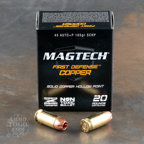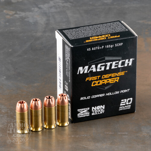 This package contains 20 rounds of Magtech First Defense .45 ACP (Auto) ammunition. Each cartridge is loaded with a 165 grain solid copper hollow point projectile. The solid construction of these high-quality bullets eliminates jacket splitting or tearing, allowing maximum target impact. These rounds also impressive terminal expansion, making them ideal for personal defense and concealed carry ammunition.