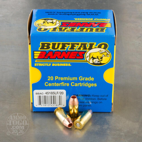 This package contains 20 rounds of Buffalo Bore .45 ACP (Auto) ammunition. Each round is loaded with a 185 grain lead-free TAC-XP jacketed hollow point projectile. These all copper bullets deliver impressive terminal expansion, penetrating deeply in spite of its light weight. Each round is also designed to produce the light recoil and high velocities usually associated with this grain weight.