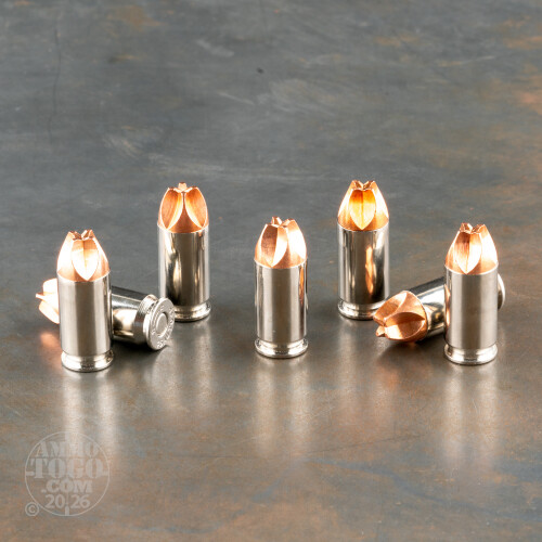 It would be atrocious of us to suggest that the hollow point is anything but suited to do its job well, but still, there are some drawbacks to its design. This 45 ACP +P cartridge addresses those marvelously with its 120 grain Xtreme Defender projectile. The bullet has got no nose cavity that could impact smooth feeding nor clog with debris as it penetrates a barrier, and its very sharp cutting edges enable it to burrow into its target incredibly deeply. Rather than expansion, this bullet takes advantage of hydraulic energy to create a gaping wound cavity. Its manufacturer boasts that the solid copper Xtreme Defender creates a wound channel up to two times greater in diameter than any hollow point could manage! Its light weight additionally creates less recoil, so you’ll have an easier time of things engaging multiple targets simultaneously.This round offers a durable Ducta-Bright 7a nickel plated brass casing. It is not only better able to endure the heat which a +P round generates, but provides protection against corrosion and more efficient feeding and extraction to boot. Underwood utilizes flash suppressed powder in all of their ammunition, so this round is a fine choice if you’re concerned that you may one day have to fight in the dark. It preserves a shooter’s night vision!