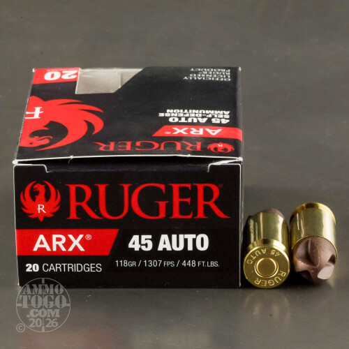 20rds - 45 ACP Ruger PolyCase 118gr. ARX Ammo Details
