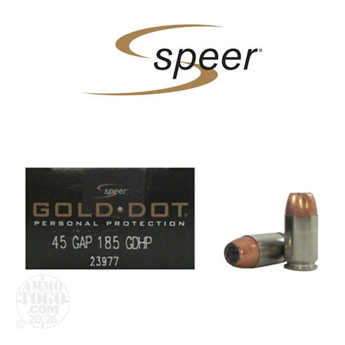 This is 45 Gap Speer Gold Dot 185gr. Hollow Point Ammo. This is the Gold Dot ammo that is sold to many Law Enforcement agencies. Speer Gold Dot Handgun Cartridges Uni-Cor construction virtually eliminates core/jacket separation, the main reason for bullet failure with conventional cup and core bullets. A patented process forms the hollow point cavity in two stages. The core is pre-fluted to define the "fault" lines of expansion, controlling final diameter and retained weight. The second process finishes the cavity and controls the rate of expansion. Clean burning propellants deliver optimum velocity while ensuring consistent chamber pressures. This ammo is packed in 20rd. boxes.
