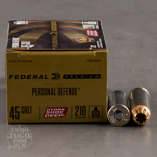 Got a hungry Taurus Judge or S&W Governor? Don’t just feed it a diet of 410 Bore. These premium metallic cartridges are a must-have for personal protection with any revolver chambered for 45 Colt!The Hydra-Shok Deep isn’t Federal’s top-of-the-line defensive bullet. The HST holds that honor, but this round’s jacketed hollow point is by no means weak by comparison. Its thick, heavily notched jacket and nose cavity’s distinctive center post both equip it for reliable passage through a wide range of barriers, as well as the jolting terminal expansion which makes a threat stop dead in their tracks.